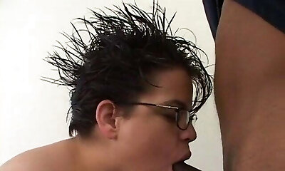 nerdy black slut in glasses sucks a pecker