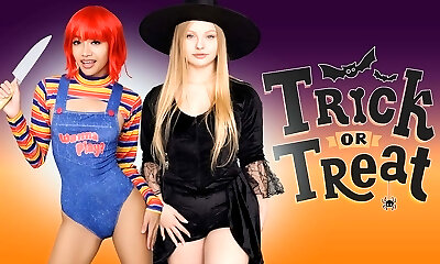 Two Girls in Latex and Leather Costumes Suck and Screw a Fortunate Bald Guy